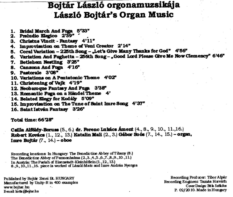 Csilla Alföldy-Boruss, dr. Ferenc Lukács Áment, Robert Kovács, Katalin Mali, Gábor Soós - orgel, Imre Bojtár - oboe